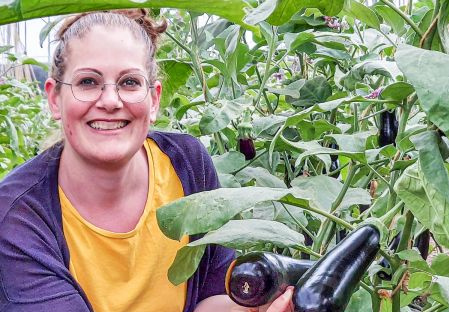 Weiterlesen →2.9.2021Sommerzeit ist Auberginen-Zeit. Bei dem feuchtwarmen Klima der vergangenen Wochen reifen unsere eigenen Auberginen zu stattlichen Exemplaren heran. Hier unsere Anna mit zwei besonders hübschen Exemplaren…