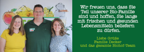 Wir freuen uns, dass Sie ab jetzt ein Teil unserer Bio-Familie sind und unsere Biokiste gewählt haben.