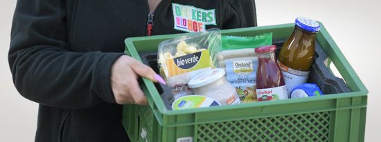 Sobald all das in der Kiste ist, rollt diese weiter auf der Packstraße zum "Team Trocken". Hier werden nun alle Trockenprodukte wie Mehl, Nudeln, Müsli, Mandelmilch, Soßen und vieles, vieles mehr dazugepackt.