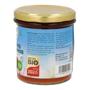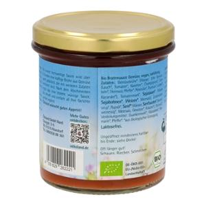 Gemüsebrühe* (Wasser, Gemüse* (Lauch*, Tomaten*, Karotten*, Champignons*, Zwiebeln*, Steinsalz, Pfeffer*, Petersilie*, Thymian*, Lorbeer*, Koriander*), Tomatenmark*, SOJASAUCE* (Wasser, SOJABOHNEN*, WEIZEN*, Meersalz), Zuckerrübensirup*, Rapsöl*, SENF* (Wasser, SENFSAATEN*, Branntweinessig*, Meersalz, Gewürze*, Kräuter*), Steinsalz, Verdickungsmittel: Guarkernmehl*; Maisstärke*, Rosmarin*, Pfeffer*.| Energie | Fett | gesättigte Fettsäuren | Kohlenhydrate | Zucker | Eiweiss | Salz |